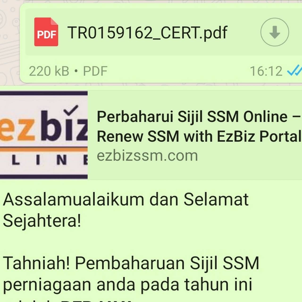 Pdf akan dihantar melalui whatsapp atau emel. Bila dan bagaimana sijil perakuan pendaftaran perniagaan dikeluarkan?